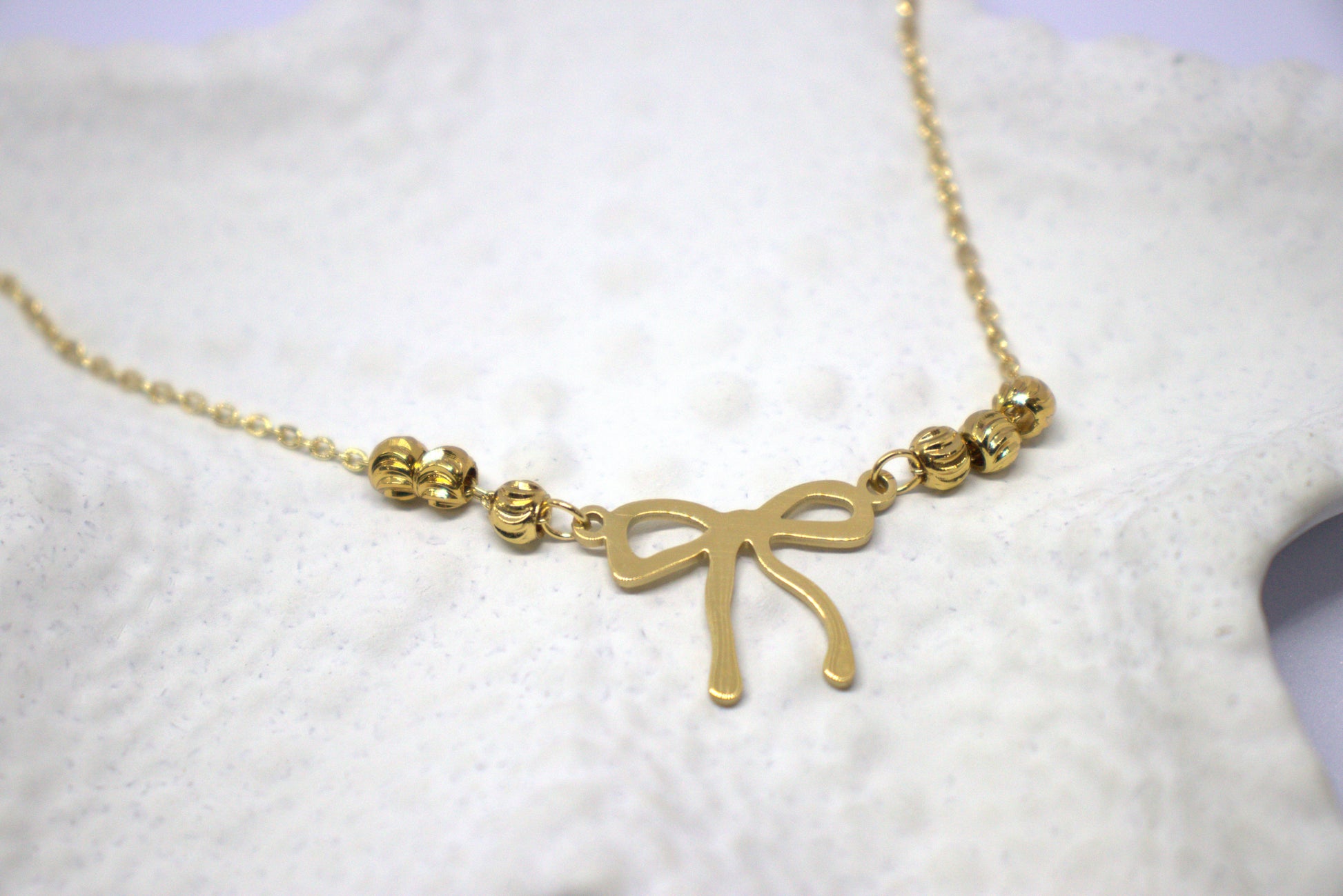 This stylish bow-shaped pendant in a rich gold color adds a bold touch to any outfit. Designed for daily wear, its anti-tarnish finish ensures lasting shine and durability. Perfectly suited for all ages, it’s a daring accessory that stands out while remaining versatile and timeless.